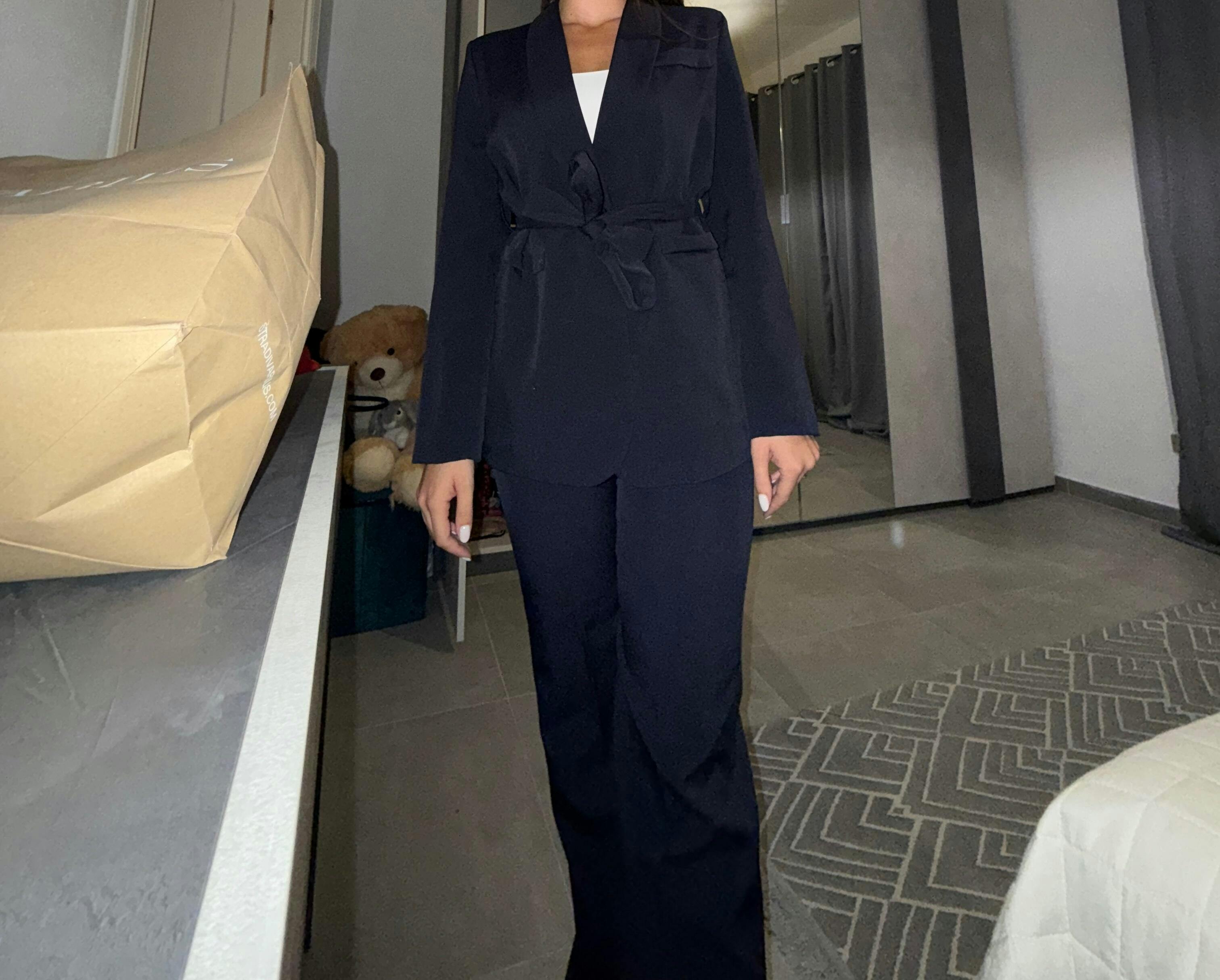 Eleganza contemporanea con un tocco di carattere. Questo tailleur con giacca lunga e cintura unisce stile sofisticato e modernità. Il pantalone a zampa e la giacca lunga creano una silhouette slanciata e di grande impatto, perfetta per chi ama distinguersi con classe.